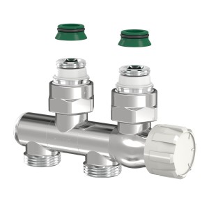 Przyłącze dwururowe VarioCon Design uniwersalne - do grzejników z podłączeniem GW 1/2 cala lub GZ 3/4, chromowane, zintegrowany zawór termostatyczny